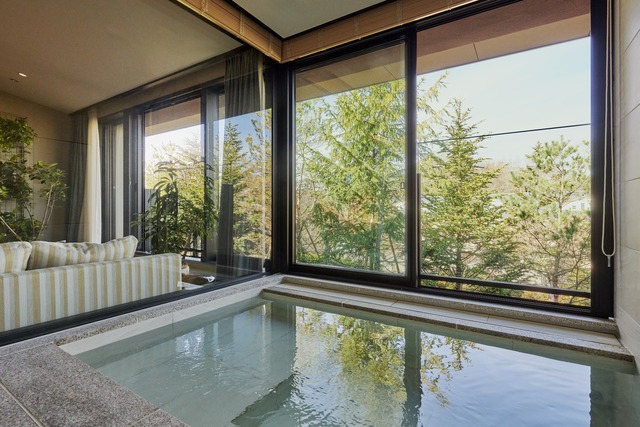 The suite configuration provides private spatial boundaries within the property, with each unit designed around its own bathing facilities and relationship with the forest environment. Karuizawa's altitude and tree cover — primarily silver birch, larch, and the mixed deciduous forest that makes the area exceptional in autumn foliage season — frame views and filter light in ways that shift continuously through the day.
